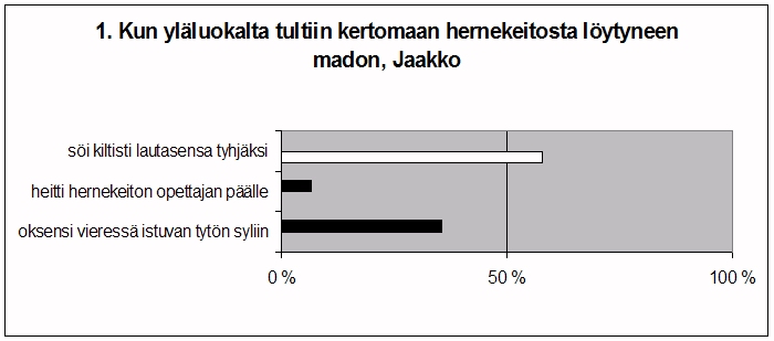 Kuvassa vastausten jakauma, oikea vastaus valkealla palkilla. Kysymyksiä on kaikkiaan 16.